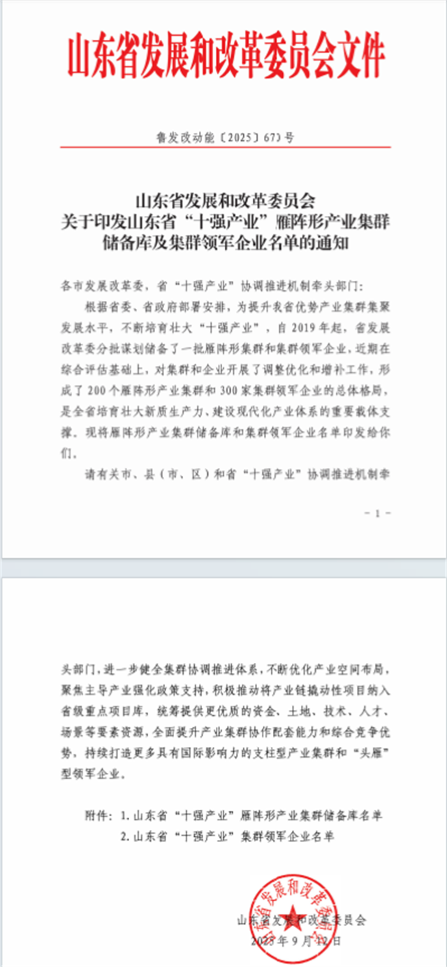 近日,省發(fā)展改革委組織開展了2025年度省“十強(qiáng)產(chǎn)業(yè)”雁陣形產(chǎn)業(yè)集群及集群領(lǐng)軍企業(yè)評選工作,經(jīng)行業(yè)評價(jià)、專家評審、綜合論證等程序,研究確定了擬增補(bǔ)雁陣形產(chǎn)業(yè)集群28個(gè),集群領(lǐng)軍企業(yè)27家。公司憑借在行業(yè)中的顯著優(yōu)勢和綜合實(shí)力,成功入選山東省“十強(qiáng)產(chǎn)業(yè)”集群領(lǐng)軍企業(yè)。